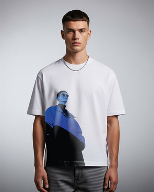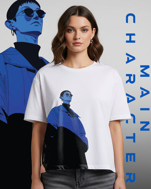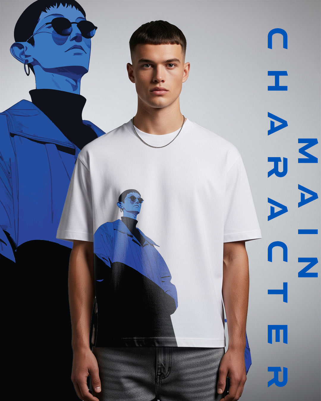 Step into the spotlight. The Main Character T-shirt is a statement of presence — featuring a bold graphic of a blue-toned figure exuding confidence, power, and individuality. Oversized and clean on crisp white fabric, this piece is built for those who live unapologetically as the lead in their own story.