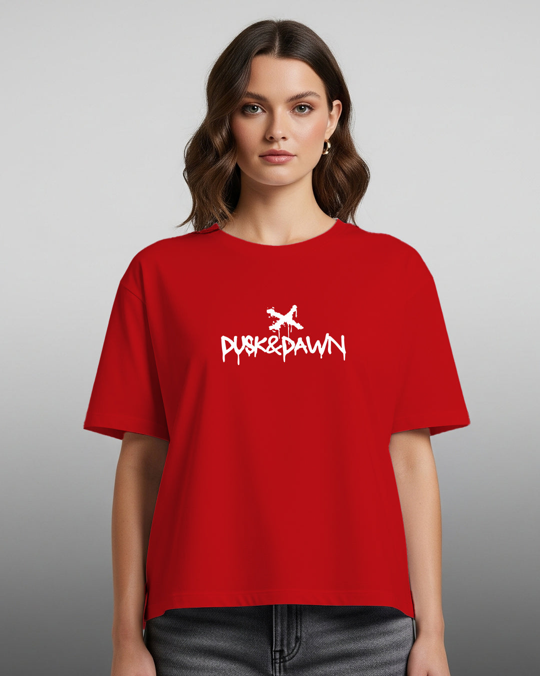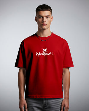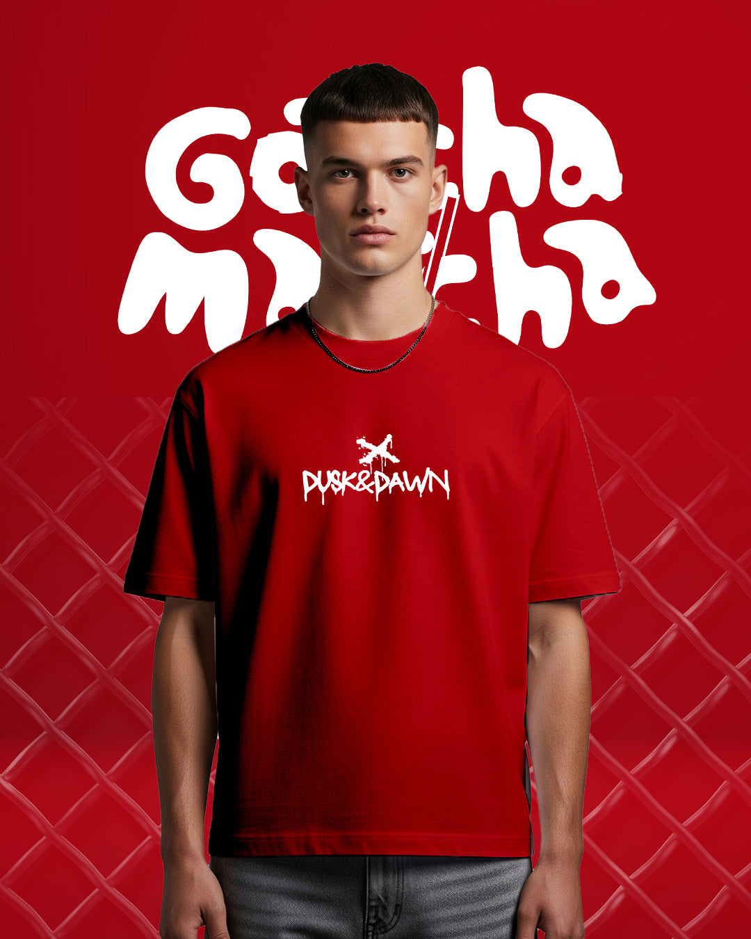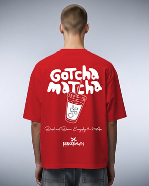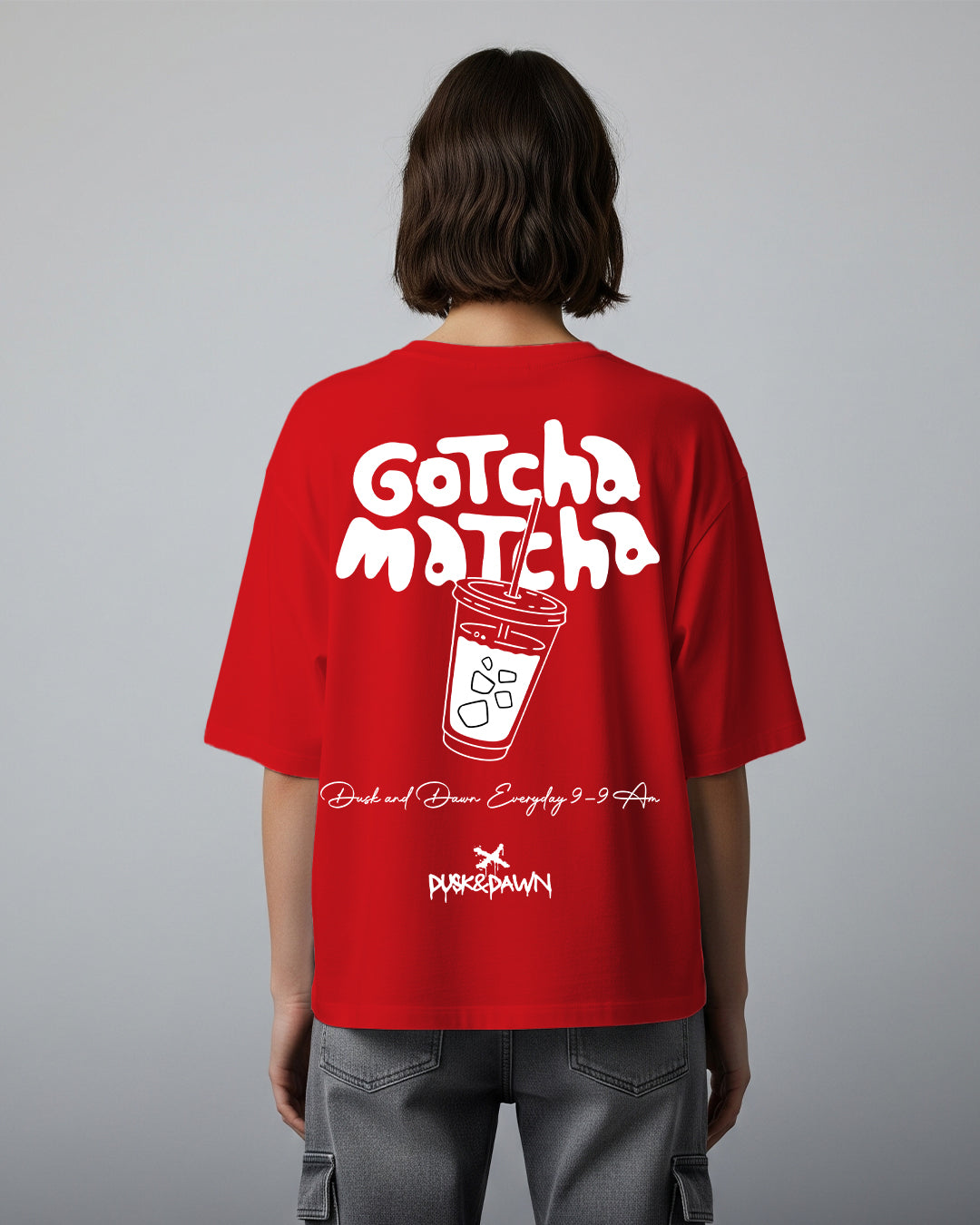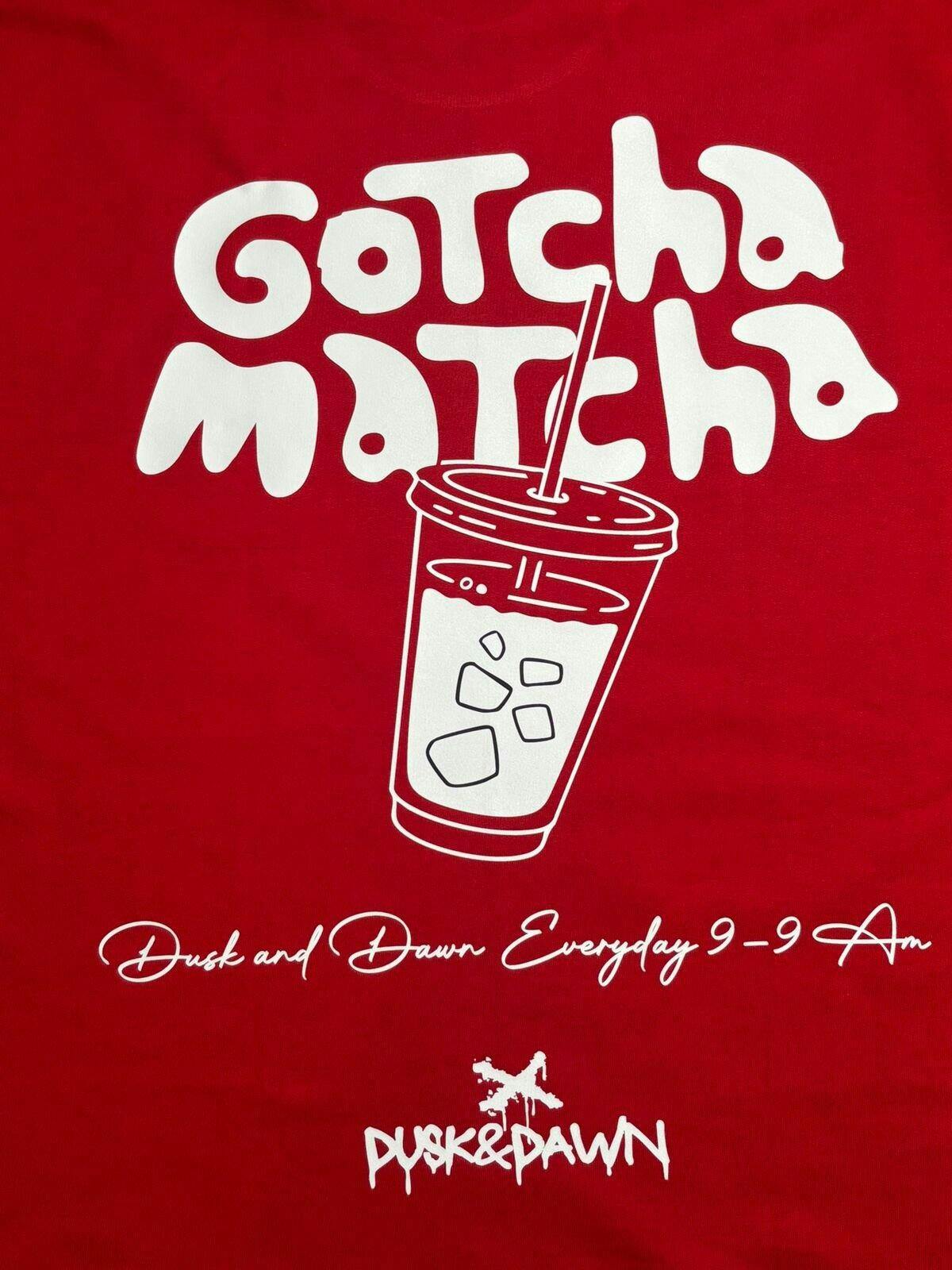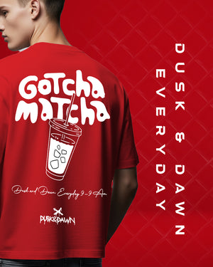 Streetwear with a flavor twist. The Matcha Hours T-shirt brings together bold red tones and a playful graphic statement — “Gotcha Matcha” iced cup print on the back paired with a clean Dusk & Dawn logo up front. Oversized for comfort, loud for presence, this tee is made for late-night hustlers and early-morning dreamers.