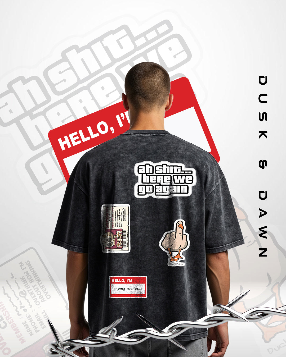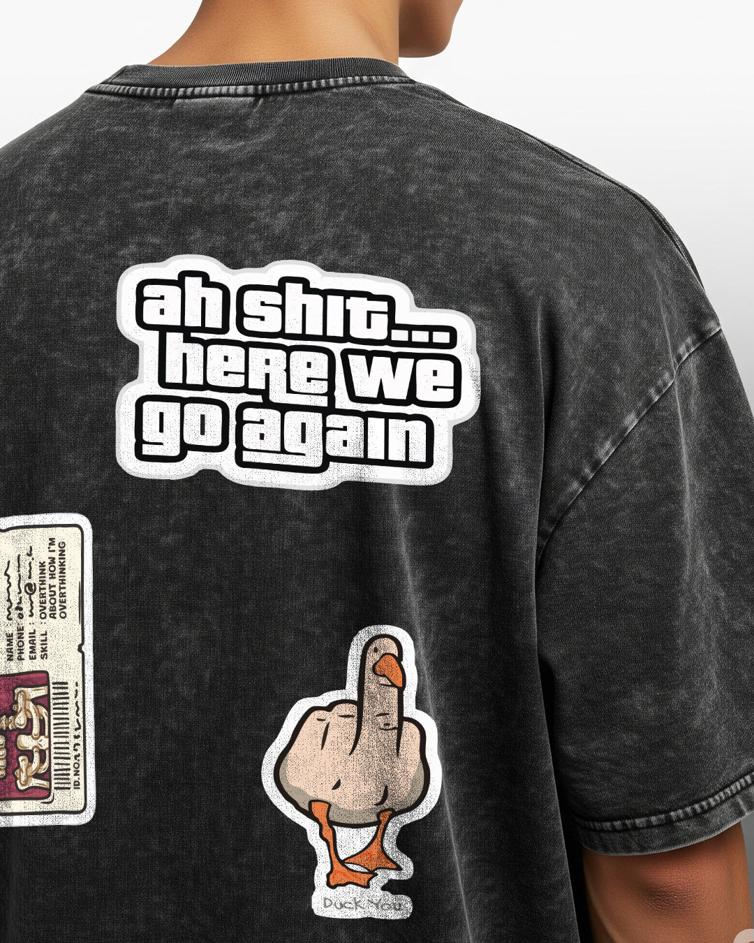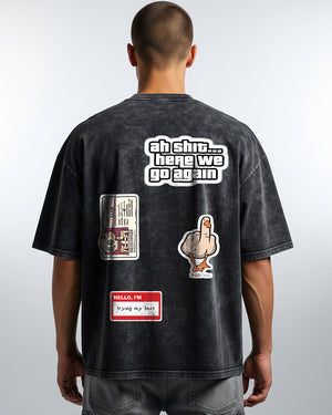 For the ones whose minds never stop running. The Overthinker T-shirt is a canvas of chaotic thoughts, sarcastic truths, and unapologetic attitude. With sticker-inspired graphics — from the iconic “Ah shit, here we go again” to bold satirical details — it’s made to mirror the wild noise inside every overthinker’s head. Oversized, acid-washed, and unapologetically loud, this tee is built for statement-makers.